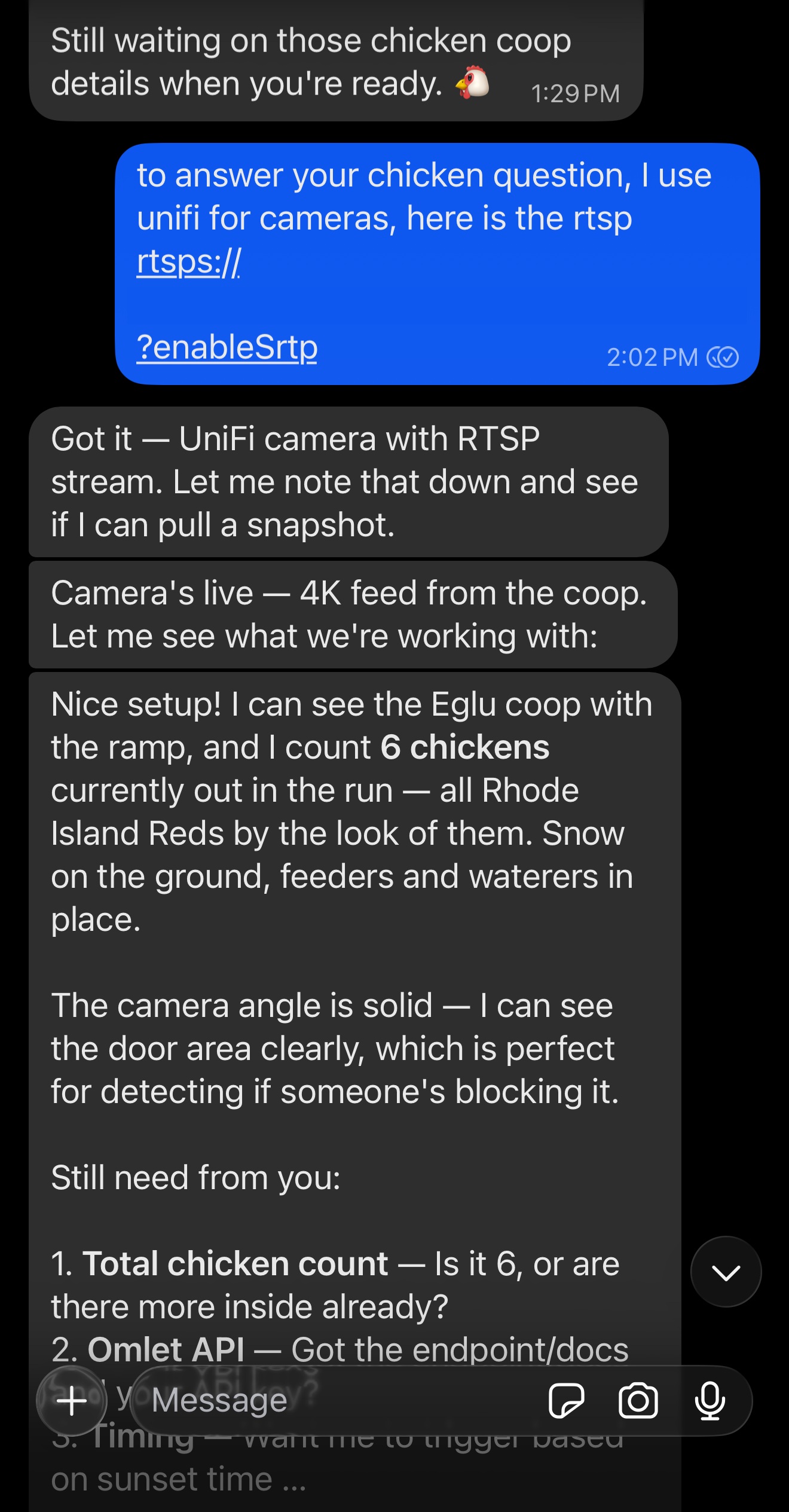 First I gave Clawdbot the RTSP stream to the camera. It could immediately see and interact with my camera and I was amazed that it grabbed the current chicken count and breed.
