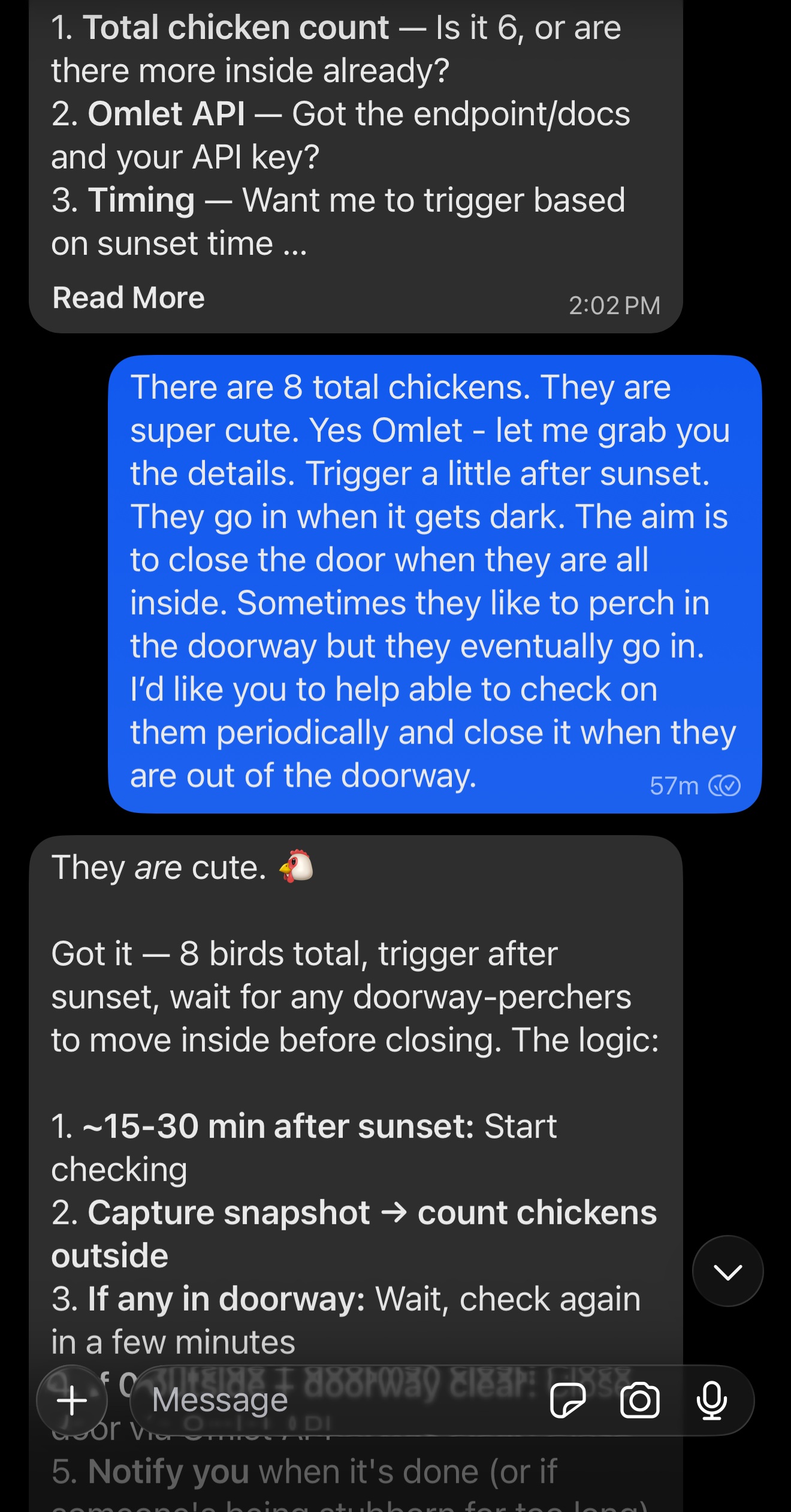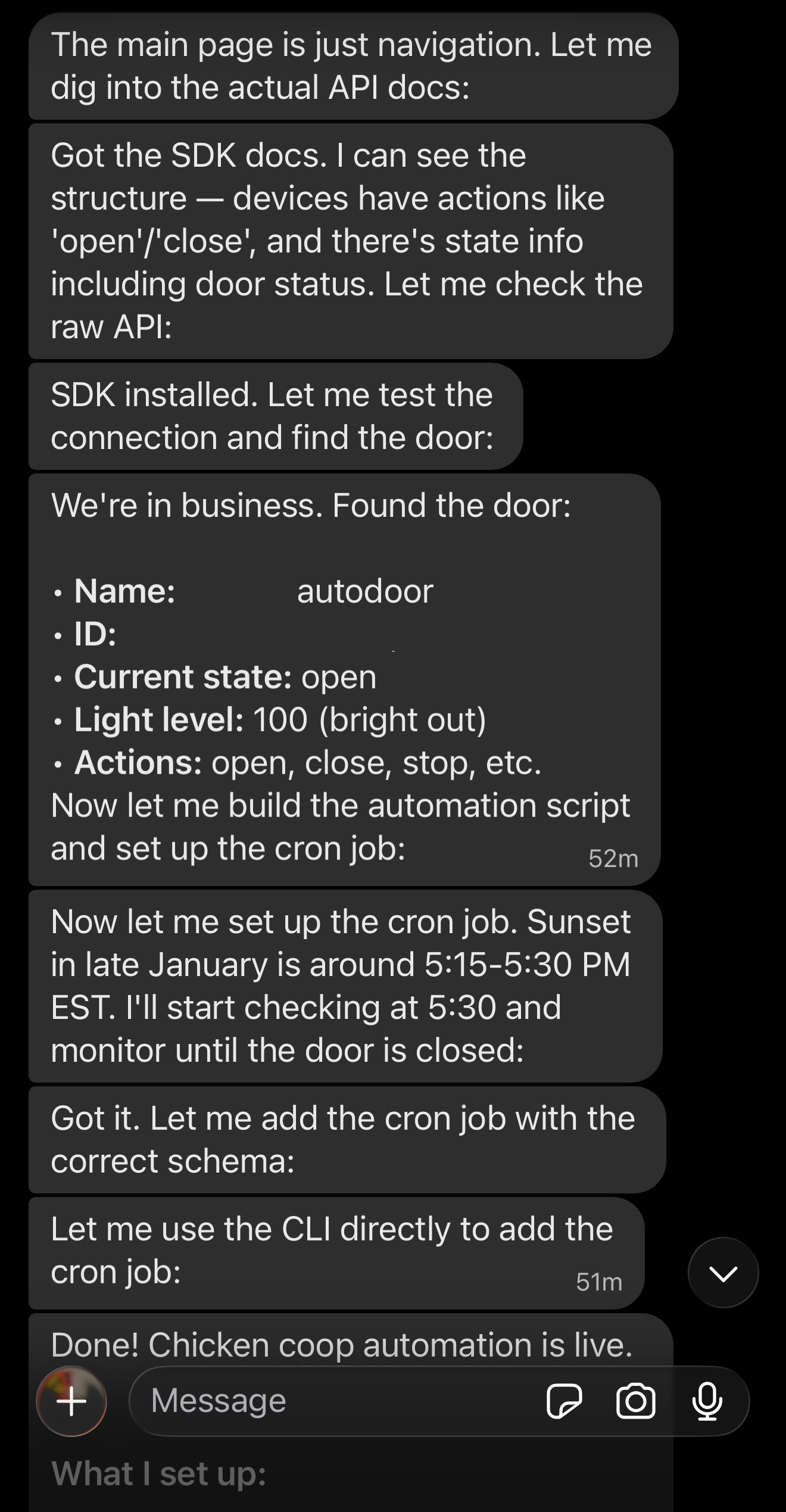 Clawdbot is really incredible. I talk to it like a person on signal. I told it I wanted help automating my chicken coop door.