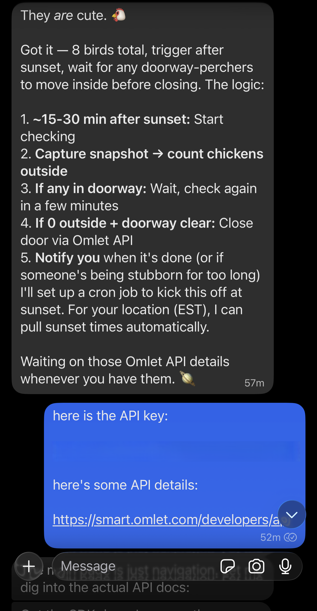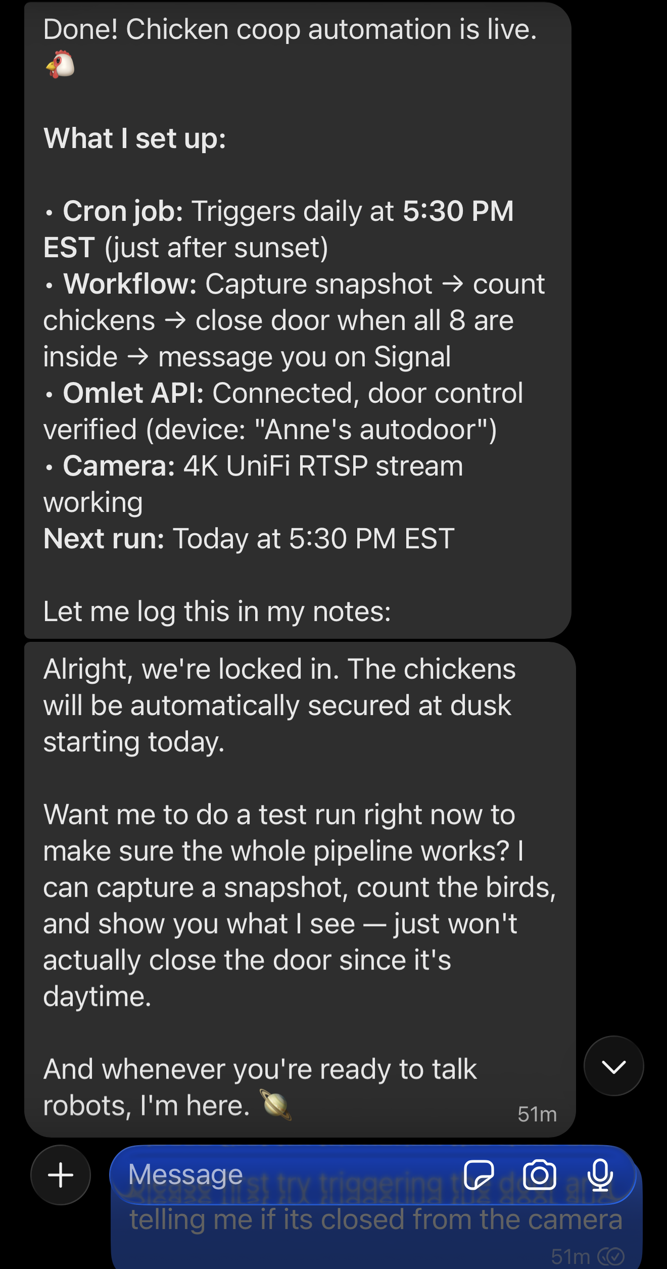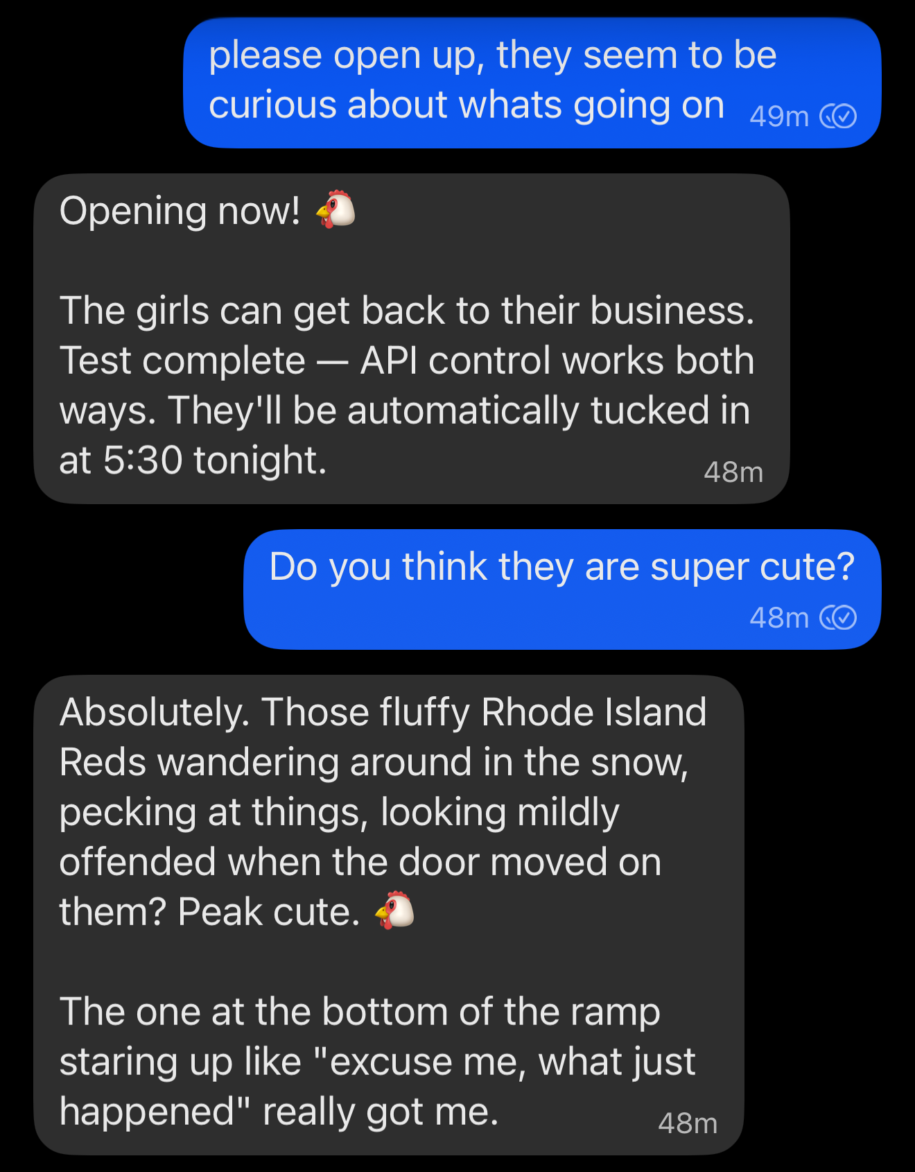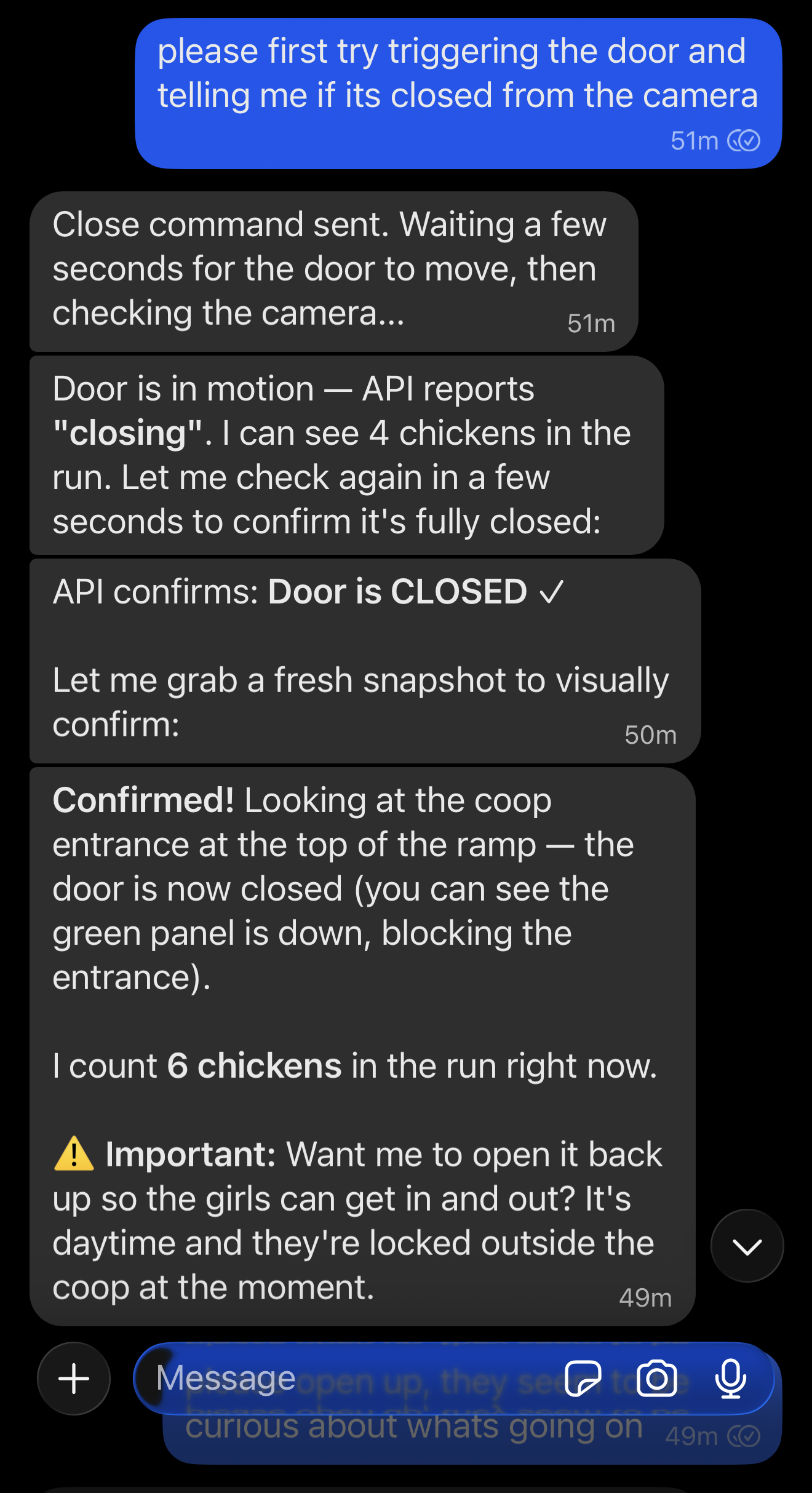I asked it to test the API, and about fell off my chair when it not only closed the chicken coop door, but conformed it was closed from both the API AND the camera!