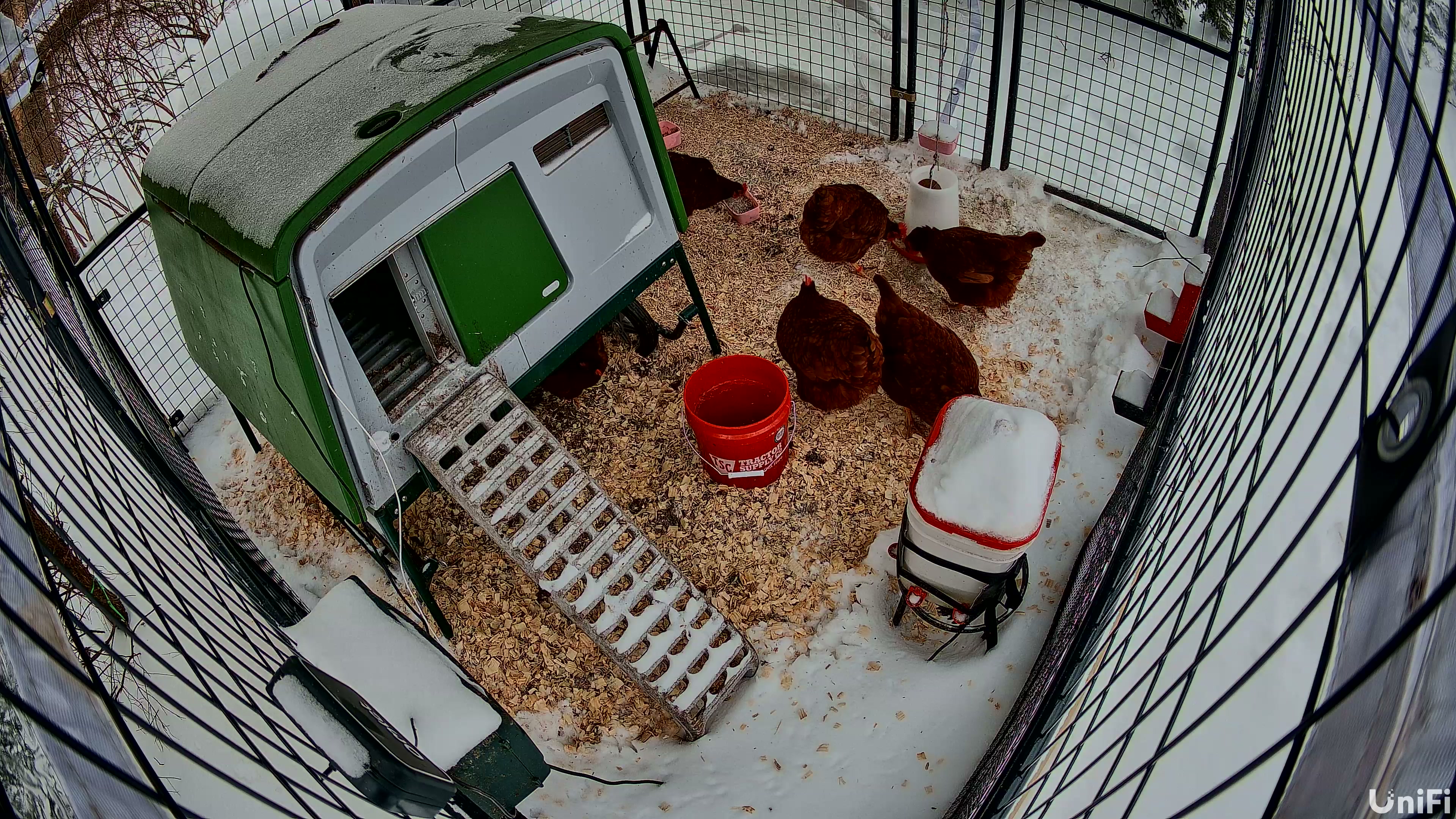 - A UniFi camera inside the coop with a 4K view of the run and door